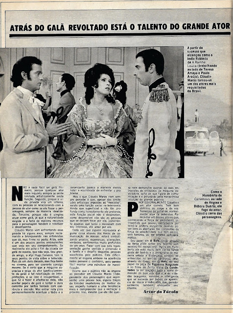 Meu domingo começou bem com essa postagem maravilhosa! Obrigada mais uma vez, Césio, pelo presente! O trio de estrelas na capa, ainda brilhando , 44 anos depois. Sílvio Santos é imortal, né Claudio Marzo, lindo e ótimo ator, mas eterno insatisfeito com a profissão. José Wilker, ainda com seu "ar riponga", que veio a perder e se tornou um homem muito elegante; três anos se passaram de sua morte e não ouço falar mais dele...Bibi Vogel, moça de olhar triste, uma vez a vi num ônibus , aqui na Zona Sul do Rio, mal vestida, com uma menininha nos braços. Soube depois que ela era ativista ferrenha das "Amigas do Peito" , grupo de mães que valorizavam a amamentação. Anos se passaram , ela já sumida do meio artístico, noticiaram sua morte na Argentina , se não me engano. Lembro-me do Lima Duarte falando sobre ela, já que haviam sido casados por um tempo. Claudio Correa e Castro, tantas vzs já comentei dele por aqui. Ator fantástico, oriundo do teatro paulista, mal aproveitado a meu ver, apesar de ter brilhado em inúmerasnovelas, tanto da Tupi, quanto da Globo. Fosse americano e teria ficado milionário, mas aqui no Brasil...Enfim, é o que temos pra hj, ah, como não falar de Sandra Bréa, bonita, boa artista, mas tb com olhar triste, poderia ter ficado mais por aqui e brilhado por mais tempo. Mas o destino não quis e levou essa constelação de astros e estrelas, em comum o olhar tristonho, de quem previa que a vida seria breve, talvez... Os Claudios, Marzo e Corr^Çea e Castro, Sandra, Bibi, Wilker, Janete Clair, Miriam Pires...Chega de nostalgia, que aqui no Rio, o tempo tá "fechando" e apesar de amar o outono, esse clima é dado a melancolia..Boa semana a todos, leitores e comandante do blog!